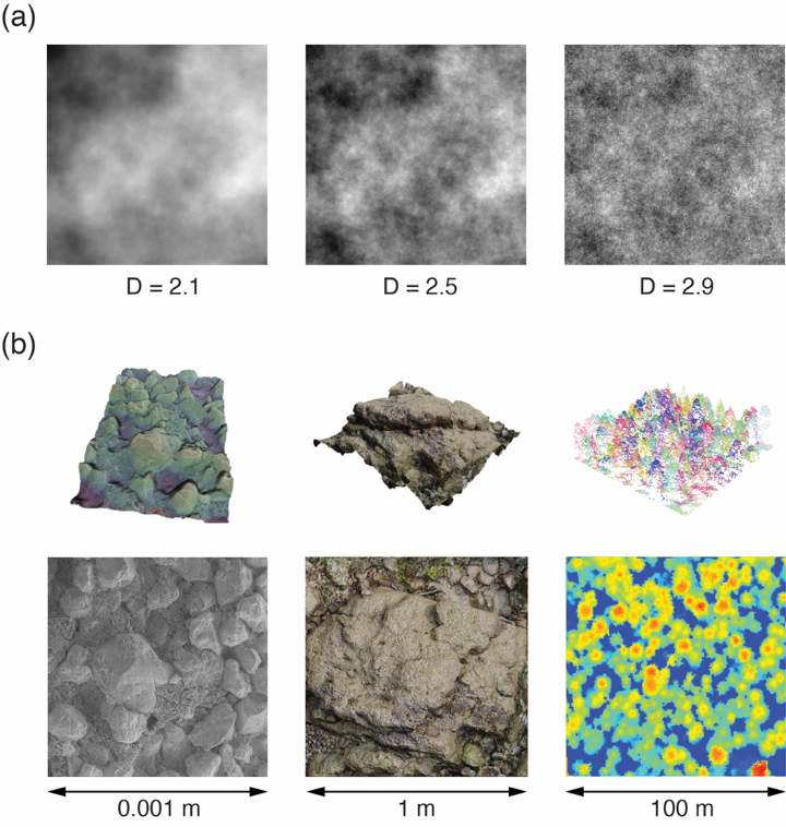 We find that fractal dimension, one of the most commonly used metrics of complexity, is fraught with problems: fractal dimension is hard to measure accurately (see second figure below); most real ecological habitats may not have fractal properties; and fractal dimension is often poorly correlated with diversity. Rugosity, or surface roughness, is another commonly used metric that is easier to measure and better correlated with diversity, but it may not capture important aspects of habitat complexity. We see promise in information-based metrics of complexity, such as entropy, which are more holistic.
