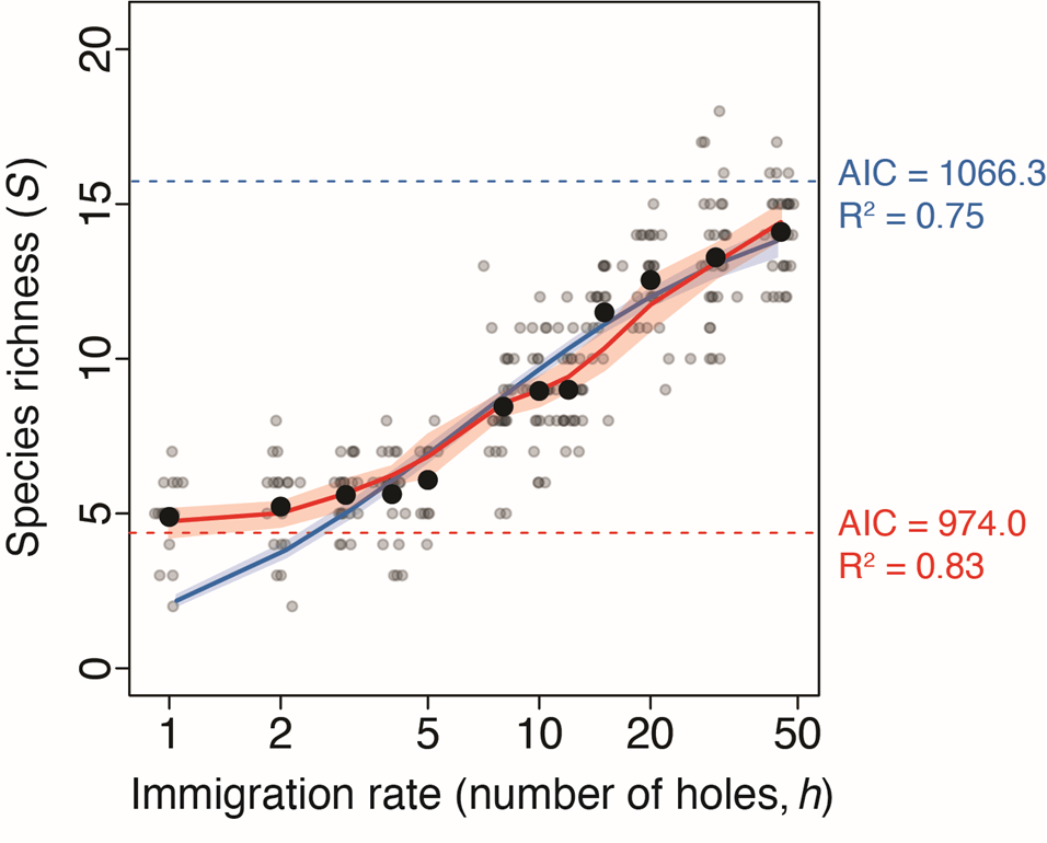 What determines the number of species that occur together in a given ecological community? One view is that species richness is driven mainly by characteristics of the local site, such as resource availability and habitat diversity. This is the niche perspective. Another view is that species richness is driven mainly by immigration from a larger region. This is the dispersal perspective. A long-standing goal of ecology is to reconcile these two perspectives. A classic unified theory predicts that dispersal assembly is observed only when immigration to a system is very low, and that niche assembly is observed in most other situations. A novel unified theory, developed by our lab (see here and here), predicts just the opposite: that niche assembly is observed only when immigration is very low, with dispersal assembly prevailing otherwise.