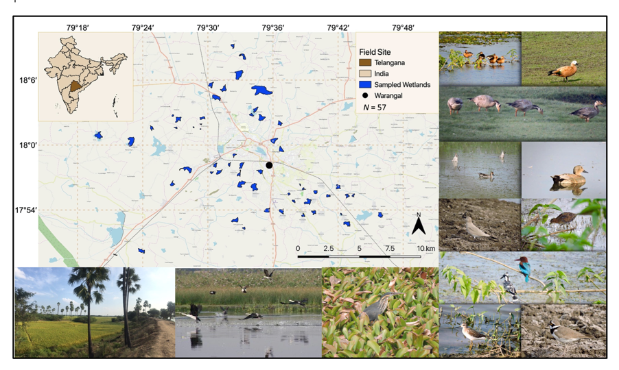 As part of her PhD research in our lab, Deepthi Chimalakonda conducted six censuses of water birds over four years at 57 wetlands in the Warangal district of Telangana state in India (see map below), with the aim of understanding the forces that structure these bird communities. These wetlands are artificial habitats created by humans for irrigation and other purposes, but they are also valuable habitat for wildlife. Such artificial ecological communities are becoming increasingly common around the world as humans continue to modify natural environments, and it is crucial to understand their potential role in conserving biodiversity.